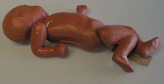 Vastasyntyneen vauvan kokoinen ja näköinen nukke. Ohutta pehmeää kumimaista vaaleanpunaista muovia,. Valmistettu muoteilla, kasvonpiirteet tehty luonnosmaisesti. Raajat irralliset, liitetty vartaloon kalastajalangasta tehdyillä sidoksilla. Päälaelle ja takaraivoon piirretty vinoneliön muotoiset kuviot kuivamustekynällä.