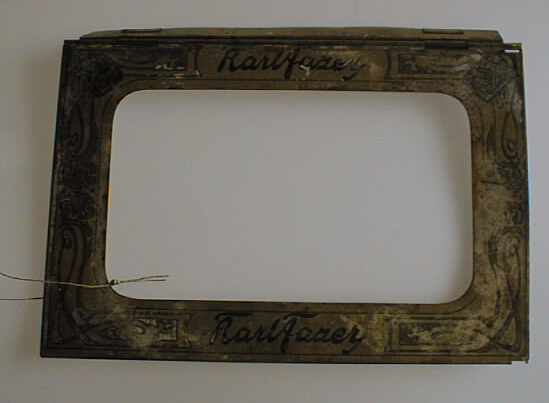 Suorakaition muotoinen peltikehys. Pelti taittuu takapuolelle muodostaen kannattimet lasille (?). Toisella pitkällä sivulla saranoitu kapea peltiliuska, joka on ilmeisesti kiinnitetty rasian tai laatikon seinään. Kehyksen päällisosassa jugend-ornamentiikkaa ja kulmissa Suomen vaakunat. Pitkillä sivuilla teksti: Karl Fazer.