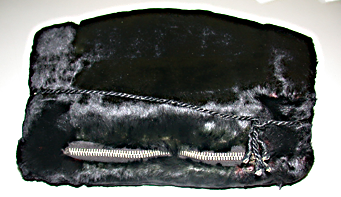 Mustaa turkista. Musta silkkivuori. Alareunassa vetoketjullinen piilotasku. Muffin ympärillä musta nyöri.