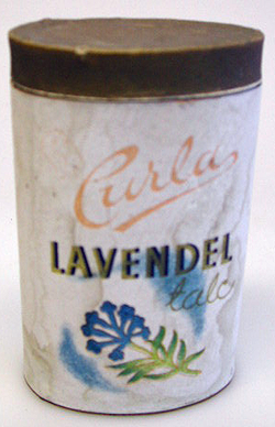 Valkoinen soikeapohjainen pahvipakkaus, jossa suorat sivut. Pakkauksen yläreunassa on pieni olka, jota vasten matala kullanvärinen pahvikansi nojaa. Pakkauksen sisällä on vielä talkkia, joka on muuttunut paakkuiseksi. Pakkauksen sivussa on teksti: Curla LAVENDEL talc ja sen alla kuva kukkasesta. Takana on valmistajan nimi.