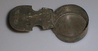 Painavaa harmaata metallia. Kuppi pohjasta pyöreä, suoraseinäinen. Niitein kiinnitetty leveä kahva, jossa muotoilu. Päiväys poikittain kahvassa, mittamerkintä (?) pitkittäin.