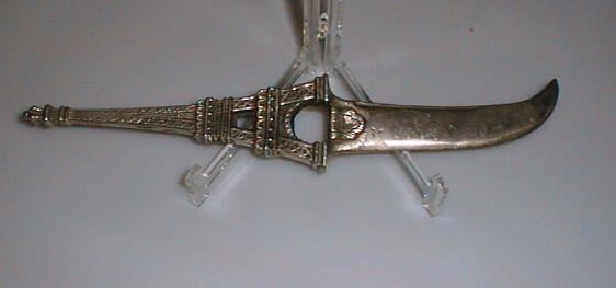 Paperiveitsi, jonka kahva Eiffel-tornin muotoinen. Terä vankka, kärki kaartuu. Kahvaosan alapäässä vuosiluku 1889.
