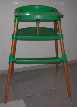 Lasten syöttötuolin jalat ovat pyöreäksi sorvattua lakattua mäntyä. Takajalat ovat enemmän viistot taaksepäin kuin etujalat. Kirkkaanvihreät muoviosat on kiinnitetty jalkoihin metalliruuvein. Selkä- ja käsinojat muodostavat puolipyöreän muodon, joiden reunoilla on neljä pyöreää koloa, johon jalkojen päät on ruuvattu kiinni. Myös istuinlevy ja jalkatuki on kiinnitetty jalkoihin ruuvein. Käsinojien tasolla on kiinteä syöttöpöytä, jonka laidoilla on matalat reunat. Syöttöpöydän takareunaa tukee sorvattu mäntytappi, joka jää lapsen jalkojen väliin.