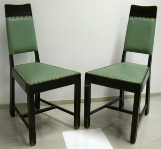tummanruskea, vihreällä tekonahalla verhoiltu tuoli. Selkänoja kapea, istuin eteenpäin levenevä. Takajalat alaspäin levenevät ja taaksepäin taipuvat, etujaloissa alasarjojen kohdalla kasviaiheiset koristekuviot. H-tukipiena. Selkänojan yläosa alaspäin kaartuva. Istuimen takaosassa, syväleiman yllä on luultavimmin ollut messinkilaatta.