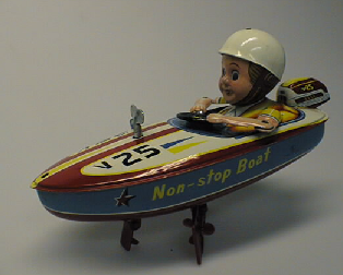 Mekaaninen vene, jossa vieterin vetoavain on veneen päällä ja samoin säädin go-stop. Veneessä kuljettaja, jolla valkoinen kypärä päässä. Kuljettajan pää ja kädet liikkuvat vedettäessä. Veneen perässä moottori. Veneen alla on potkuri, joka liikkuu. Veneen päällä teksti V 25. Kyljissä teksti: Non-stop Boat ja tähti.