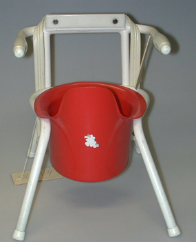 Lasten pottatuoli, jonka runko on valkoisella muovilla päällystettyä taivutettua metallia. Jalat levenevät alhaalla ja päätyvät muovisuojuksiin. Käsinojissa on on myös suuret muovisuojukset. Selkänoja on muovinen tukipala, johon on kiinnitettynä muovinen valkoinen kiinnityshihna painonapein. Irrotettava punainen muovipotta lepää muoviettun putken varassa. Se etuosan reuna on korotettu.