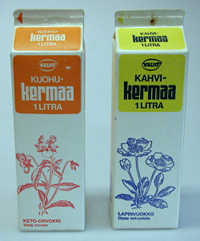 Muovitetusta pahvista valmistettu 1 litran kuohukermatölkki. Suorakaiteenmuotoinen, pohjassa kuumasaumatut saumat. Kahden vastakkaisen sivun päät eli siivekkeet litistetty kuumasaumauksella harjakkeiseksi suuaukoksi. Tölkin kahdella sivulla oranssilla pohjalla tuotteen nimi, joka toisella puolella suomeksi; VALIO KUOHU-kermaa 1 LITRA, toisella ruotsiksi; VALIO VISP-grädde 1 LITER. Tekstien alla on kuvat keto-orvokista ja niiden alla tekstit KETO-ORVOKKI/STYVMORSVIOL Viola tricolor. Kahdella muulla sivulla kerrotaan kerman ravintosisältö suomeksi ja ruotsiksi. Lisäksi kerrotaan tuotteen säilyttämisestä ja keto-orvokista sekä annetaan juustoraasteresepti. Suuaukon siivekkeiden alla on valmistajan ja pakkauksen nimet ja avausohjeet.