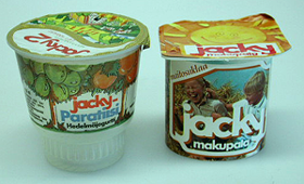 Lieriönmuotoinen, muovinen Jacky-makupala-merkkisen maitosuklaavanukkaan purkki. Vetoisuus 1, 25 dl. Pohja soikea ja siinä teksti "FORMSEAL", kansiosa kuusikulmainen ohut muovilevy, jonka reiän peittää auringon kuvalla sekä "jacky makupalai" tekstein painettu alumiinikalvo. Lieriömäisessä säiliöosassa saumastaan teipillä kiinnitetty paperinen päällinen, jossa pohjana valokuva koirasta ja vanukasta syövistä lapsista piknikillä heinäkasassa ja sen päällä teksti" jacky makupala maitosuklaa". Takapuolella kerrotaan vanukkaan valmistusaineet sekä säilytysohjeet suomeksi ja ruotsiksi. Toisessa sivussa myös kohta "viimeinen myyntipäivä".