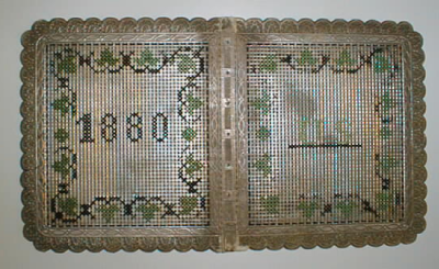 oikealta puoleltaan hopeavärillä väritetty, reiitetystä pahvista valmistettu kansio, joka on koristeltu ristipistoin silkkilangoin. Takakannessa vuosiluku 1880 ja etukannessa nimikirjaimet LS.