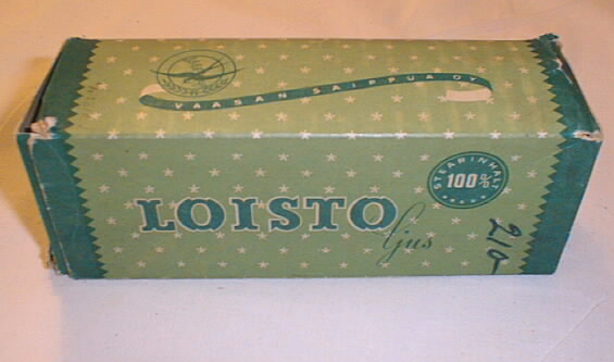 Pahvilaatikossa vihreät painatteet: Loisto, 100 % steariini, 20 kpl kuusenkynttilöitä. Sisällä 12 eri pituista pätkää kellertäviksi painuneita kynttilöitä.