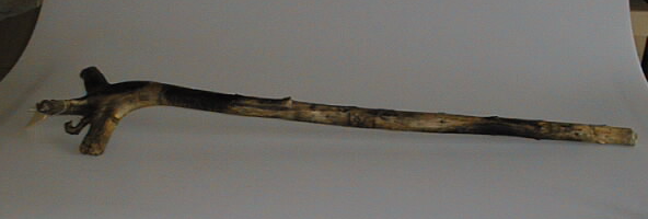 Karsitusta ja kuoritusta nuoresta kuusesta valmistettu "matkasauva". Juurakkopään haaroja jätety jäljelle, pisin toimii kädensijana. Pinnassa poltettuja suuria tummia alueita. Kaverrus Kiljava 1961.