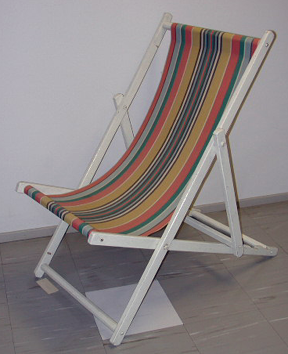 Kokoontaitettava aurinkotuoli, jonka kehikko on valkoiseksi maalattua koivua. Kehikko koostuu kahdesta ristikkäisestä kehikkoparista, joiden takaosaan on kiinnitetty selkänojan kaltevuutta säätelevä tukikehikko. Tuolin puuosat on kiinnitetty toisiinsa ruuvein. Kehikon istuimeksi on ommeltu puuvillakangas, tekniikkana on loimiripsi. Kankaassa on pitkittäisiä raitoja, joiden värit ovat punainen, vaalensininen, vihreä, keltainen, musta ja valkoinen. Kankaan sävyt ovat säilyneet paremmin tuolin toisella puolella.