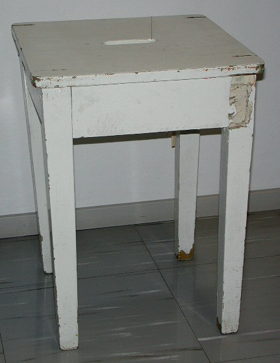 Neliskulmaiset hieman alaspäin kapenevat jalat, joita yhdistävät sarjat. Kolmen tukipalan avulla istuinlevy on ruuvattu alaosaan. Istuinlevyssä on kädensija-aukko. Puu maalattu valkoisella maalilla, jonka alta pilkottaa vaaleanvihreä maali.