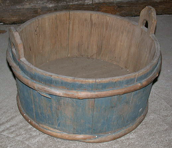 Kimpityötä. Matala korvallinen siniseksi maalattu kimpiastia jossa puuvanteet ( 2kpl ). Korvat puoliympyrän -muotoiset. Pyöreäpohjainen. Vanteet löysät.