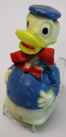 Seisova sinitakkinen ja -lakkinen Aku Ankka, jolla kaksi pyörää alla. Kaulassa punainen rusetti. Sivussa pyöreä kohomerkki, jossa "Marx toys Made in Hongkong", vastakkaisella puolella kohokirjaimin " C Walt Disney Productions".