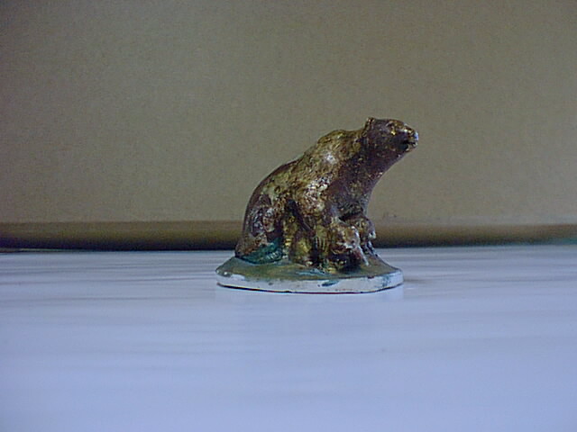 Soikeahko jalusta, jonka keskellä naturalistisesti muotoiltu karhuveistos, etutassujen välistä kurkkii 2 pentua.