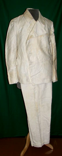 Kaksiosainen;takissa herrainkaulus,kaksirivinapitus (napit puuttuvat) ed.olk.päältä pitkittäisleikkaus,kääntyy vyötäröllä vaakaleikkaukseksi,kauluksessa kolme ommeltua lenkkiä mol.puolin.kansitaskut.Suorat hihat kolmesta kpl:sta,kaksinkertaiset hihansuut.Takakappaleessa muotoleikkaukset selästä.Housut suorat,käänteet lahkeensuissa,edessä piilonapitushalkio,neljä nappia..kts lisätieto ....