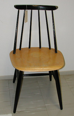 1950-luvun pinnatuoli, jossa on sorvatut jalat ja pinnat. Jalat ja H-tukiristikko on muotoiltu päistään kapeneviksi. Istuinlevyn alla on jalkojen kiinnitystä varten puiset tukipalat. Sorvattuja pinnoja on kuusi kaarevasti rivissä ja niiden yläpäässä on ohut kaareva hartialauta. Jalat, H-tukiristikko, pinnat ja hartialauta on maalattu kiiltävällä maalilla mustiksi. Istuinlevy on muotoiltua vaneria, joka on lakattu selluloosalakalla. Istuinlevyn etureuna on pyöristetty alaspäin kaarevaksi.