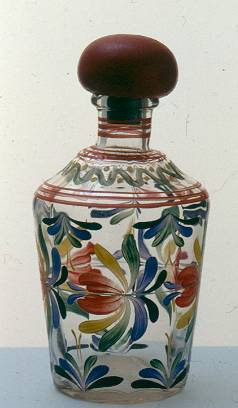 Pyöreä, suureunassa paksunnos, kaula suora, kaulan alta viistosti pyöristetty ja profiloitu, alaosa kapenee pohjaa kohti. Laitoihin maalattu kukka- ja raitakoriste. Keskiosassa kehässä viisi moniväristä, vanhojen, kansanomaisten maalauskoristeiden tyylistä kukkaa ja niiden ylä- ja alapuolella vastakkaisesti pienempiä kukkia. Kaulassa, kaulan alla ja taitteessa kolmen punaisen raidan kehät. Pyöristyksessä polveilevaa nauhaa ja pisteitä. Isoissa kukissa mustaa, sinistä, vihreää, keltaista ja punaista. Pienissä mustaa, sinistä, vihreää ja keltaista. Punainen puutulppa, alle kiinnitetty päältä naulalla korkki, tattimaisen kupera, pyöreä, alta kovera. Naula ruostunut.