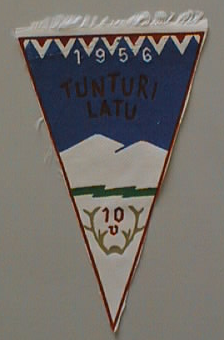 Kolmion muotoinen,kovitettu Lapin maisema-viiri.Valkoiset tunturit,sininen taivas,Ruskeat poronsarvet ja punaisella 10v ja TUNTURIN LATU ja kolmion reunat,vuosiluku 1956.
