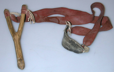 Kahva haarakkaasta oksasta, Y-muotoinen. Pyörän sisäkumistaa leikatut punaiset kuminauhat on sidottu haarojen päihin ja kiinnitetty lankasolmulla. Kuminauhojen toisiin päihin lankasidoksella kiinnitettty soikeahko nahankappale, jossa 4 pientä reikää kiinnitysreikien lisäksi.