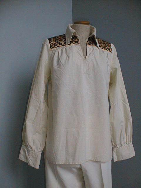 Valkoinen paita, jossa lyhyt halkio edessä, taitetut paitakaulukset, pitkät hihat. Edessä ylhäällä koketti, jossa rypytys, sen yläpuolella vihreä-oranssi ristipistokirjailu, joka ulottuu olkasaumaan saakka. Selkäpuolella myös koketti. Hihansuissa rannekkeet, nappikiinnitys.Helman sivut kaartuvat.