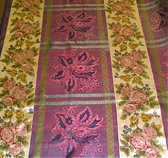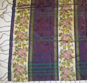 neliön muotoinen silkkiliina, jonka jokaisessa reunassa on hapsutus. Kuosiinkudotuna vuorotelle valkoisella ja violetilla langalla kudottuja vyöhykkeitä, joihin sijoitettu lehti ja ruusuaiheita. Ruusut on painettu valkoiselle pohjalle.Muut kuviot on kudottuja.