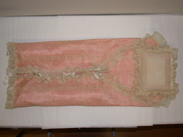 Tyynyn päällys valkoista hienoa pellavapalttinaa. Etupuolta kiertää 2,6 cm leveä pohjaommeltu pitsi, jossa lehtiaihe. Reikäommel sen kummallakin puolella. Tyynyn reunoissa 5 cm leveä tyllipohjainen pitsi, jossa kasviaihe, pitsi kiinnitetty kaksinkeraiseksi. Kiinnitys 3 nauhaparilla. Sisätyyny vaaleanpunaista silkkiä, jonka pitkällä sivulla jatkos nauhasta. Sisu höyheniä.