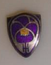Kilven muotoinen merkki, jossa lukollinen neula takana. Etupuolellatyylitelty orvokki ha kirjain H.