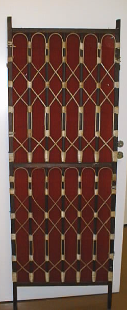 Muodostuu neljästä pystyn suorakaition muotoisesta kappaleeesta jotka ovat olleet yhdistettynä messinkisaranoilla ( nyt rikkoontuneet). Kappaleet tehty tummaksi petsatusta rimasta, kussakin yksi poikkipuu keskellä ja pystysäleikköä. Säleet yhdistetty vaalealla rottinkisidoksella, joka muodostaa vinoristikkoa. Säleikön takana tummanpunainen palttinakangas, joka on kiinnitetty kehyspuihin pienillä nauloilla.Yläreunassa olleet rottinkiset koristeet ovat hävinneet pientä palasta lukuunottamatta.