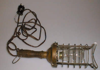 Lyhyt puine sorvattu kahva, siinä kiinni messinkiholkki, jossa kiiinni sinkitystä raudasta tehty häkki. Häkki irroitettavissa holkista, ruuvikiinnitys. Häkin pääty muotoiltu jaloiksi; voidaan säilyttää pystyssä. Sisällä Airamin kirkas suuri hehkulamppu. Kahvan toisessa päässä reikä, jossa (vääntynyt) rautalankakoukku. Ruskea muovipäällysteinen johto, bakeliittinen töpseli.