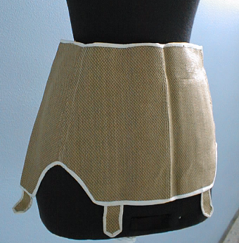 Toisesta sivusta hakasrivistöllä (6kpl) kiinnittyvä paperikankaasta ommeltu liivi. Hakasrivistä puuttuu joka toinen koukkuosa. Reunoja kiertää valkoinen 0,5 cm levyinen puuvillakangasreunake. Liivi on ommeltu 6 osasta ja on alaspäin levenevä. Alareunassa on ommeltuna 4 pientä reunustettua läppää. Yhden läpän alla on painettuna : 70.Hakaset on kiinnitetty suojaavalla vaaleanpunaisella merseroidulla puuvillakangaskaitaleella.