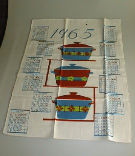Paksua valkoista palttinaa. Suorakaition muotoinen pyyhe, johon pystysuunnassa painettu tyyliteltyjä kattiloita, vuosiluku 1965 ja kuukausien kalenterit. Reunat koneommeltu, ripustuslenkki. Värit: sininen, punainen, vihreä.