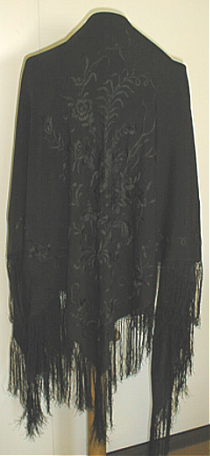hapsureunainen, neliön muotoinen huivi, jonka yhdessä kulmassa on kukka-aiheinen laakapistokirjontakoristelu. Kukka-aiheen korkeus 85 cm. Reunassa tiheä hapsurivi, jonka hapsut ensin solmittu 2 cm matkan toisiinsa, loppuosa laskeutuu vapaasti. Hapsut silkkiä.