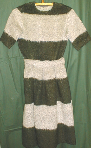 vyötäröhame, joka kiinnitetään yläosaan hakasilla (6 kpl). Hameosa laskostettu pehmein laskoksin vyötärökaitaleeseen. Vasemmassa sivusaumassa hakasilla kiinnittyvä halkio.Yläosa lyhythihainen ja kaulukseton. Oikeassa sivussa vetoketjuhalkio, johon upotettu tasku.