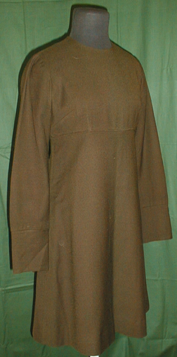 pikähihainen, melko vartalonmyötäinen leninki, jossa pyöreä pääntie ja melko ylös sijoittuva vyötärösauma. Vetoketjuhalkio pääntiellä takana (40 cm).leninki on vuoritettu ruskealla asetaattikankaalla.
