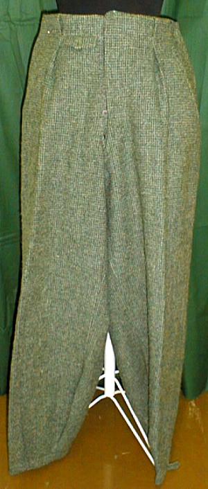 paksuhkoa ja karkeaa villakangasta olevat leveälahkeiset ulkoiluhousut, joiden lahkeet suljetaan pohkeiden kohdalta soljella.Upotetut takataskut, viistot upotetut etutaskut ja edessä läpällinen kello- tai kolikkotasku. Edessä napitushalkio, 4 nappia ja yksi hakanen. Edessä ja takana napit olkaimia varten. Napeissa teksti ELANTO.