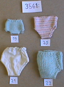 Vaaleansinisestä villalangasta neulotut lahkeettomat nuken housut.
