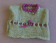Vihreästä villalangasta neulottu hihaton mekko, jossa punaisesta villalangasta tehty kaulus ja vyö.