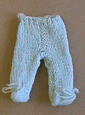 Vaaleansinisestä villalangasta neulotut pitkälahkeiset umpilahkeiset housut, joissa nilkan kohdalla kiristysnauhat samasta langasta. Vyötärön kohdalla kuminauha.