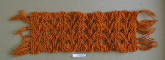 Oranssi, reiälliseksi neulottu suorakaiteen muotoinen nuken matto, jossa hapsut lyhyillä sivuilla.