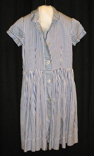 n. 8-10- vuotiaan tytön lyhythihainen puuvillamekko. Edessä alas asti avautuva napitus( 6 nappia), pääntiellä pieni laakakaulus. Pääntie kiinnittyy painonapilla. Vyötäröllä sauma, johon alaosa on poimutettu. Sivuilla vyölenkit. Vyö puuttuu.