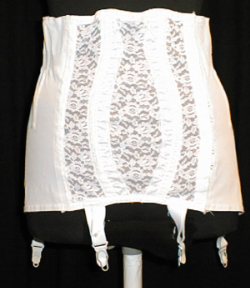 valkoisesta elastaanista, harso- ja pitsikankaasta ommeltu vyötärön ja lantion peittävä korsetti, joka kiinnitetään 12 hakasella vasemmasta sivusta. Helmassa yht. 4 sukkanauhalukkoa. Tukea antamassa pystysuunnasssa yhteensä yhdeksän "luuta" eli metallinauhaa.