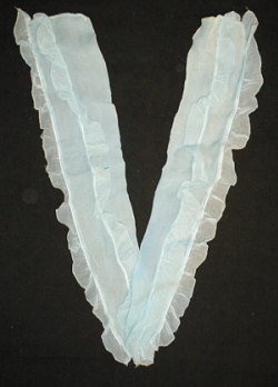 kaksi irrallista kaulusta, joiden ulkoreunassa on somisteena kaksi vierekkäistä samasta kankaasta tehtyä poimutelmaa.