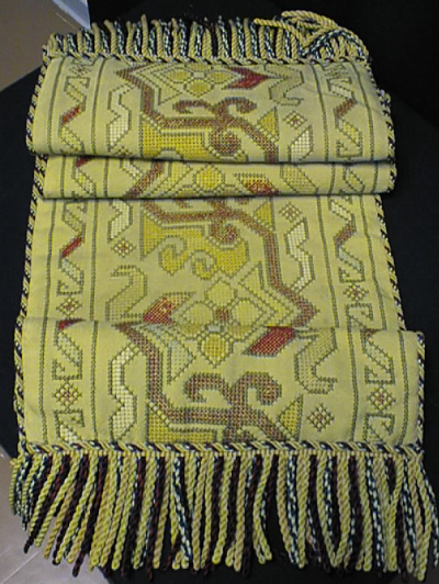keinutuolinmatto, jonka päissä on kierretyt villalannkahapsut. Keskiosan villaiselle palttinakankaalle on kirjottu ristipistoin villalangalla geometrisia kuvioita sekä tyyliteltyjä kasviaiheita (esim tulppaani).