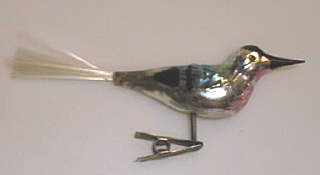 Hopeanvärinen lintu, jonka jalkana metallijousi, jousi päättyy metalliseen pihtiin. Linnun nokka ym detaljit mustia, rinta aniliinin punainen, selkä sininen. Pyrstö nailonkuitukimppu (ei alkuperäinen).