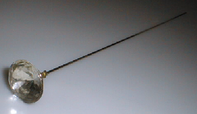 Pitkä ohut neula, jonka päässä kartion muotoinen kuparipeltinen kanta, johon on istutettu kirkkaasta lasista valmistettu nuppi. Nupin pinta viisteinen.