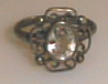 Ohut rengas, jossa viistehiottu kirkas koristekivi. Kivi istutettu alta avoimeksi, ympärillä hopeakiehkuroista muotoiltu siro kehys.