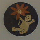 Pyöreä pahvimerkki, jossa sinipunaisella pohjalla istuva lapsi punainen vuokko kädessään.