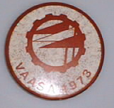 Pyöreä merkki, jonka etupinta muovitettu. Valkoisella pohjalla hammasratas, jonka sisällä viirejä. Teksti: Vaasa 1973. Takana lukollinen neula.